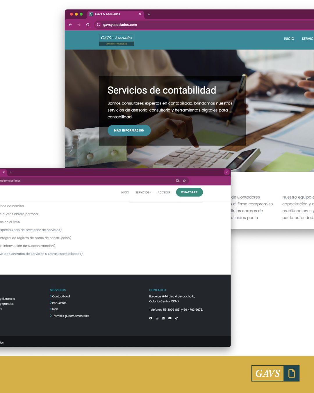 El despacho de contadores GAVS & Asociados me buscó para hacer un diseño de identidad nuevo y un sitio web a manera de plataforma digital que ayudaría a administrar los recursos que comparte con sus clientes, como facturas, resúmenes o trámites y a su vez los clientes pueden comunicarse directamente con el despacho.